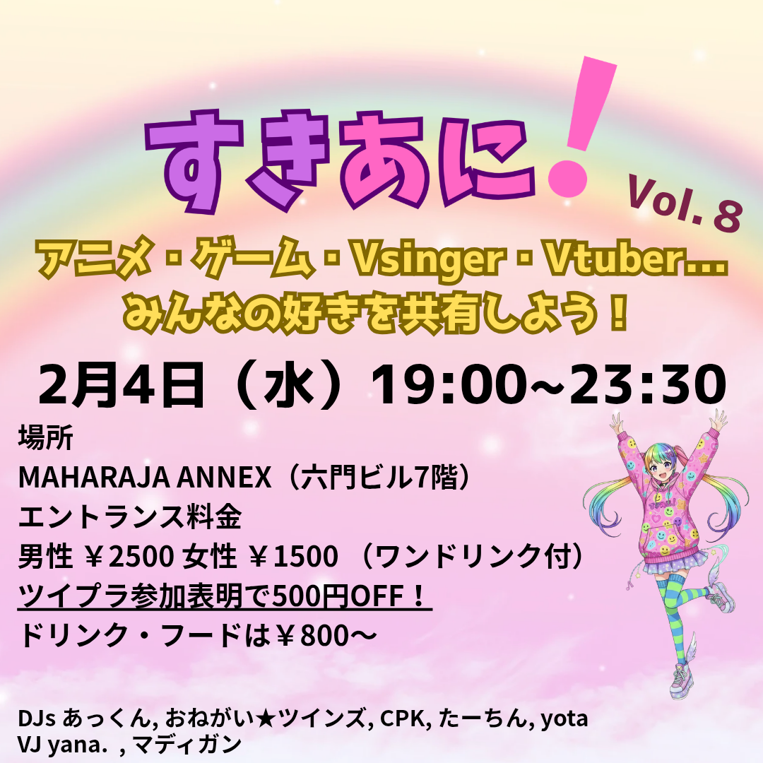 Home EVENT すきあに! Date 2月 04 2026 Time 19:00 - 23:30 すきあに! Share this event + Add to Google Calendar + iCal / Outlook export 00 days 00 hours 00 minutes 00 seconds